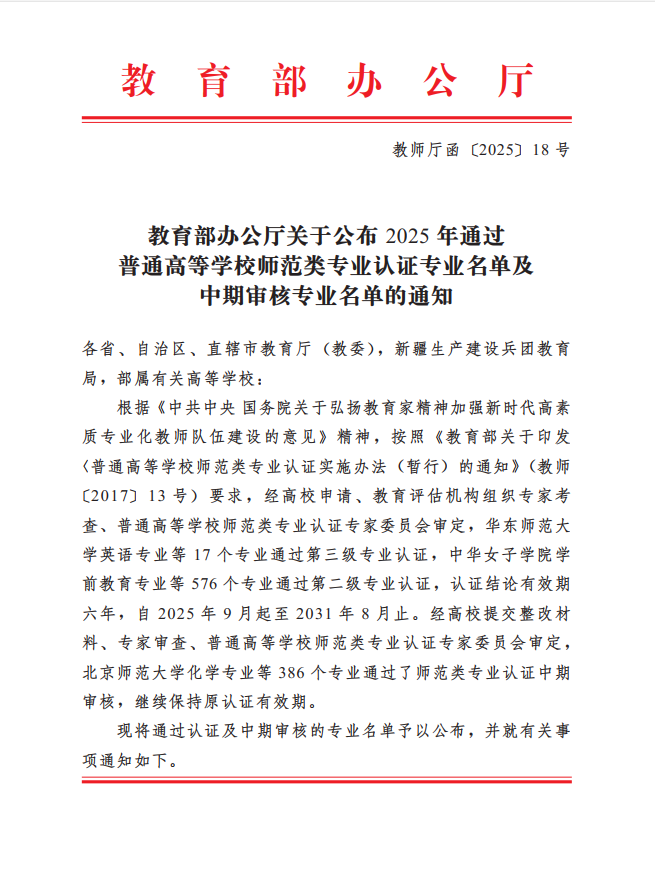 近日,教育部办公厅发布《关于公布2025年通过普通高等公司师范类专业认证专业名单及中期审核专业名单的通知》(教师厅函〔2025〕18号),公司英语专业顺利通过教育部师...